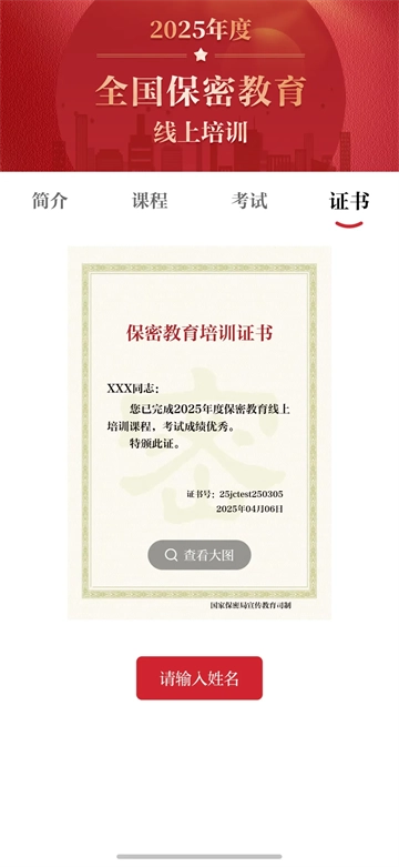 考試成績合格,系統(tǒng)將自動(dòng)生成證書,可填寫姓名并將其保存至手機(jī),自行打印。