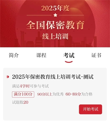 完成4學(xué)時(shí)的學(xué)習(xí)后,請點(diǎn)擊“考試”板塊下的“開始考試”按鈕。本次考試時(shí)長為30分鐘,試卷總計(jì)25道題目,包含20道單項(xiàng)選擇題和5道判斷題。考試滿分為100分,成績達(dá)到90分及以上為優(yōu)秀,60分及以上為合格。