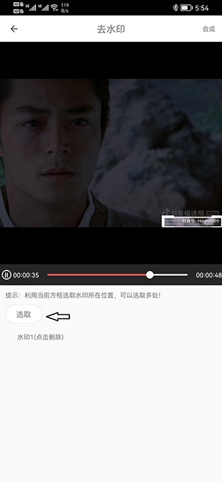 3、去水印的操作很簡(jiǎn)單,視頻界面上會(huì)有一個(gè)框框,把水印區(qū)域框選進(jìn)去,點(diǎn)擊選取后,下方就會(huì)出現(xiàn)相關(guān)列表。