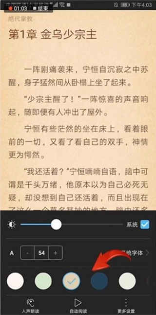 3、在閱讀界面輕觸屏幕中央,即可調(diào)出控制菜單,通過該菜單能查看目錄和進(jìn)度條,還能對亮度、背景色、朗讀模式以及自動(dòng)翻頁等功能進(jìn)行自定義設(shè)置。