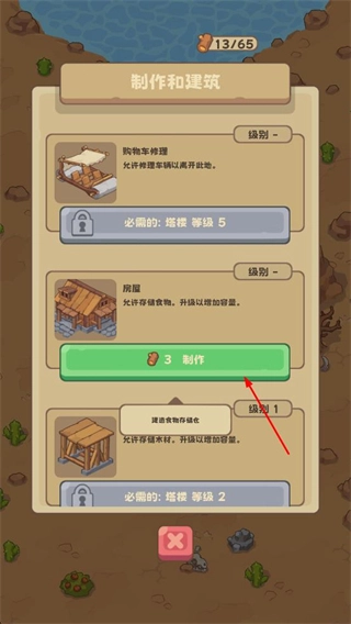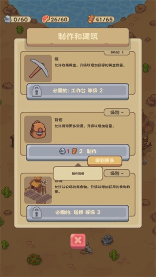 1、在制作和建筑界面,消耗資源點(diǎn)擊制作解鎖工具/建筑,滿足等級條件后可解鎖更高級設(shè)施,拓展生存能力。