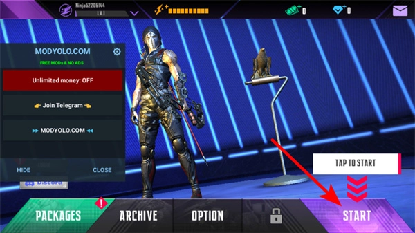1、在游戲主界面,點擊START按鈕進(jìn)入任務(wù)關(guān)卡,同時可通過PACKAGES、OPTION等功能入口,提前配置道具調(diào)整游戲設(shè)置。