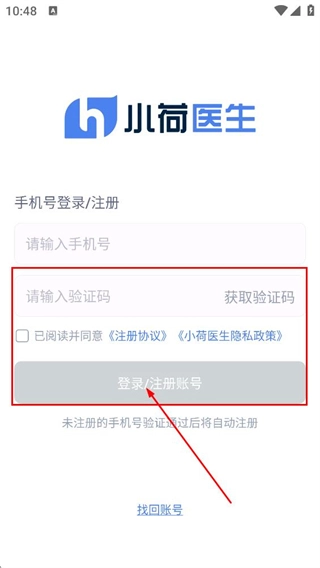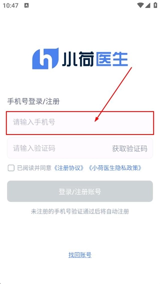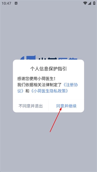 在個人信息保護指引彈窗里,點擊“同意并繼續(xù)”按鈕,即可進入小荷醫(yī)生的登錄或注冊頁面。