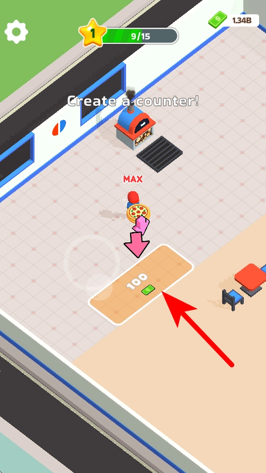 3、當(dāng)界面出現(xiàn)提示時(shí),點(diǎn)擊箭頭所指引的柜臺(tái)建造區(qū)域,消耗資源來解鎖柜臺(tái)設(shè)施,這是升級(jí)店鋪服務(wù)能力的關(guān)鍵環(huán)節(jié);柜臺(tái)能夠提升出餐效率,從而推動(dòng)店鋪等級(jí)的提升進(jìn)程。
