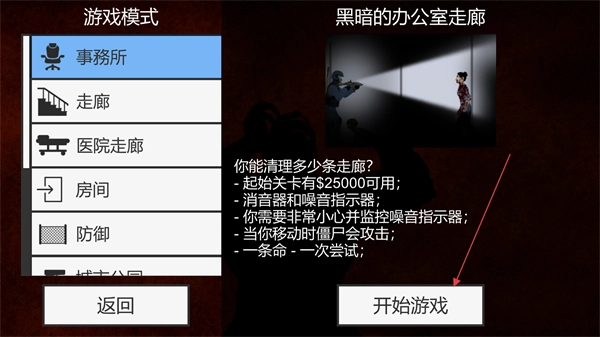 2、選擇事務(wù)所分類下的黑暗的辦公室走廊模式后,點(diǎn)擊開始游戲進(jìn)入該關(guān)卡,此關(guān)卡初始有$25000資金,需監(jiān)控噪音指示器行動(dòng),僵尸會(huì)在移動(dòng)時(shí)攻擊且僅有一次嘗試機(jī)會(huì)。