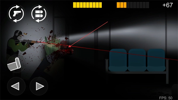 4、進(jìn)入戰(zhàn)斗界面后,操控角色用武器射擊僵尸,界面上方進(jìn)度條顯示狀態(tài),擊敗僵尸可獲得得分,還能通過底部按鈕控制角色移動(dòng)。