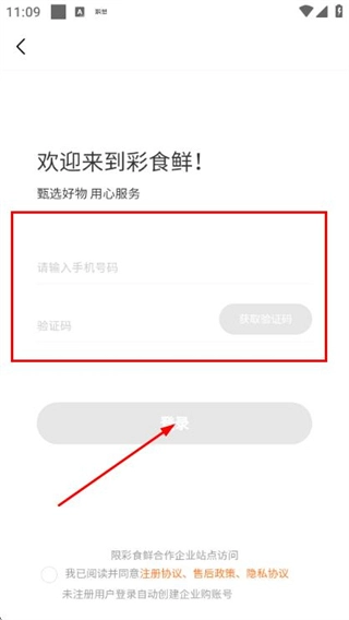 3、在登錄頁面填寫手機(jī)號和驗(yàn)證碼,勾選協(xié)議后,點(diǎn)擊登錄完成賬號登錄操作。