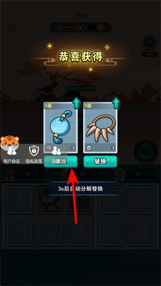 1、獲得新裝備后,點擊替換按鈕可更換當(dāng)前穿戴的裝備,通過替換更高屬性的裝備如加防御、血量的飾品,提升生存與戰(zhàn)斗能力。