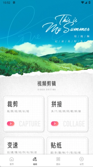 3、在編輯頁面中提供了裁剪、拼接、變速以及貼紙的功能;