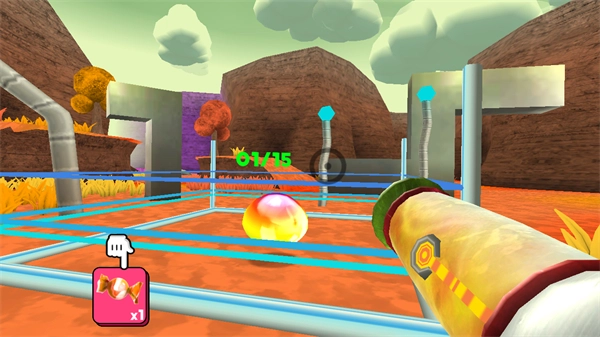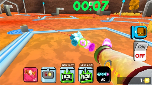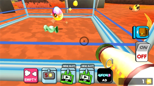 1、在這個游戲場景里,你需要操控武器瞄準目標來收集彩色糖果,與此同時,底部道具欄里粉色糖果的數(shù)量顯示為1,而界面上方的倒計時代表的是糖果的生產(chǎn)時間。