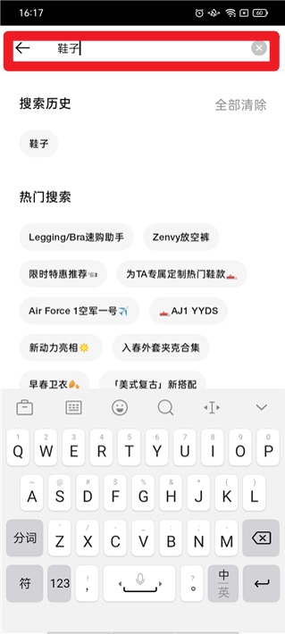 2、在搜索頁(yè)面輸入“鞋子”等關(guān)鍵詞后,系統(tǒng)會(huì)自動(dòng)呈現(xiàn)相關(guān)商品及熱門推薦內(nèi)容,用戶可依據(jù)自身需求挑選喜歡的運(yùn)動(dòng)鞋服,整個(gè)操作過(guò)程直觀且便捷。