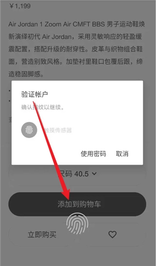 5、在商品詳情頁(yè)點(diǎn)擊添加到購(gòu)物車時(shí),需通過(guò)指紋或密碼驗(yàn)證賬戶信息,驗(yàn)證通過(guò)后方可完成添加操作,以此保障購(gòu)物安全。