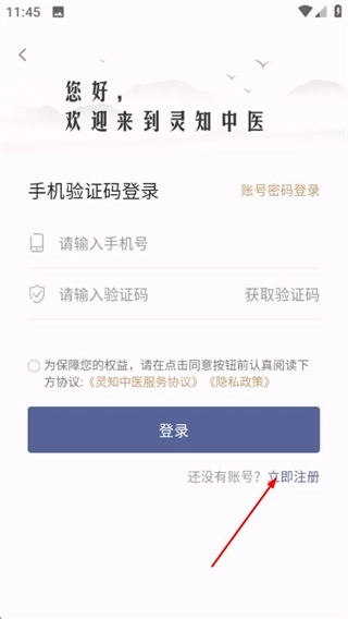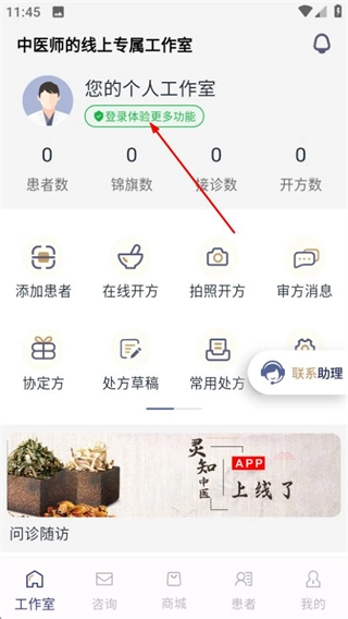 1、在靈知中醫(yī)首頁,點擊登錄體驗更多功能區(qū)域,進入登錄頁面。
