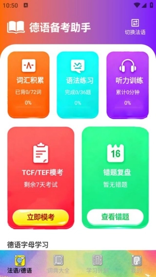 zlet單詞工具箱是專為法語與德語學習者設計的一站式學習軟件,從基礎字母發(fā)音到高階備考沖刺都可提供全方位支持,不管是零基礎入門積累詞匯,還是備考TCF/TEF考試的考生進行強化訓練,都能借助個性化設置滿足學習需求,輕松攻克外語學習的難點。