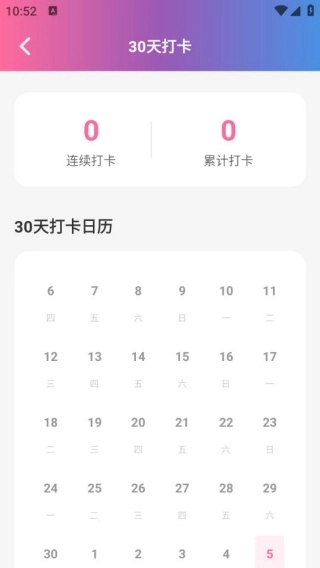 4、進入30天打卡界面后,每天的學習與記背任務都能進行打卡操作,系統(tǒng)會對這些過程進行詳細記錄。