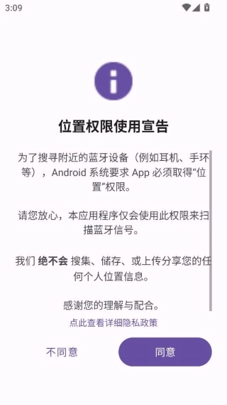 1、安裝以后,查看位置權(quán)限適使用宣告后點擊同意。