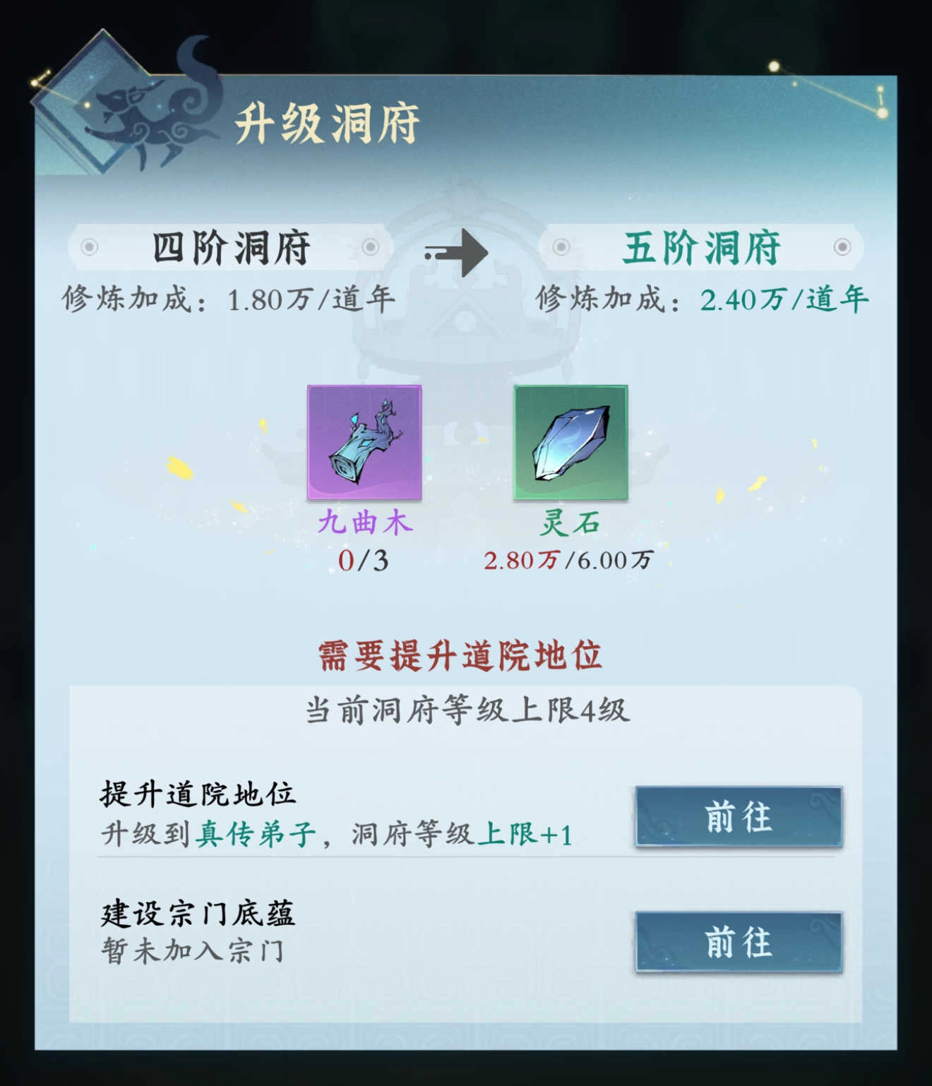 1. 洞府升級:洞府升級可加快自動吐納靈氣的速度,升級所需的九曲木可通過參與宗門活動,完成宗門貢獻(xiàn)任務(wù)來兌換獲取。