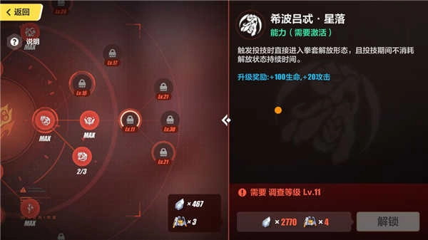 右側(cè)一欄中的“星落”可以讓卡蘿爾進(jìn)入拳套解放狀態(tài),且期間不會(huì)消耗解放狀態(tài)時(shí)間,建議11級(jí)時(shí)就點(diǎn)出。(下圖為解放狀態(tài)的講解)