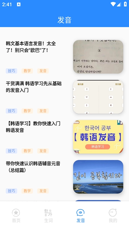 4、在“發(fā)音”板塊,有韓語(yǔ)發(fā)音的基礎(chǔ)知識(shí)文章。