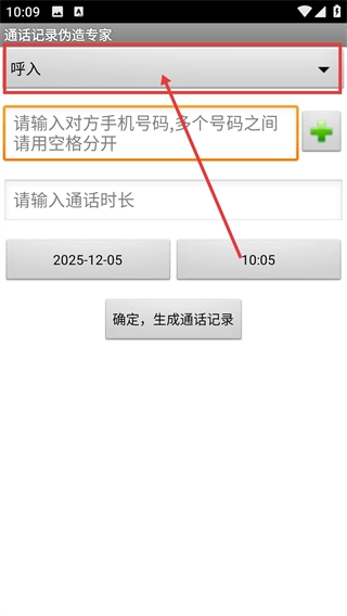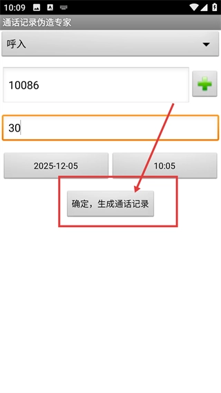 3、把日期設(shè)置為【2025-12-05】,時間設(shè)置為【10:05】,然后點擊底部的【確定-生成通話記錄】按鈕就可以啦。