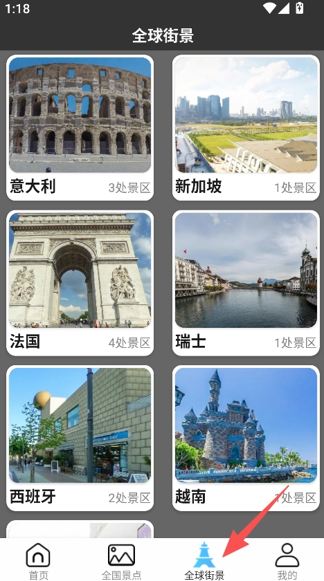 2、在全球街景頁面選擇目標國家查看熱門景區(qū)。
