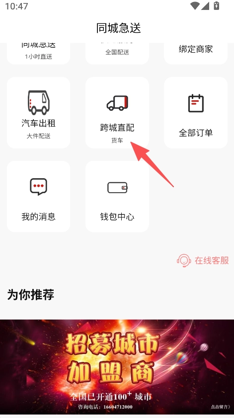 1、打開(kāi)同城急送APP進(jìn)入首頁(yè)后,點(diǎn)擊選擇跨城直配板塊。