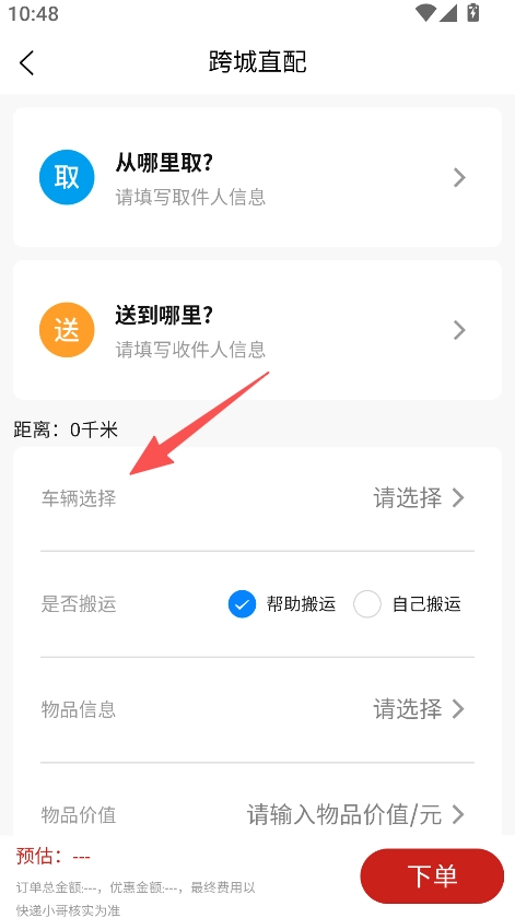 2、在跨城直配頁(yè)面填寫(xiě)取件和收件信息,選擇車(chē)輛類(lèi)型。