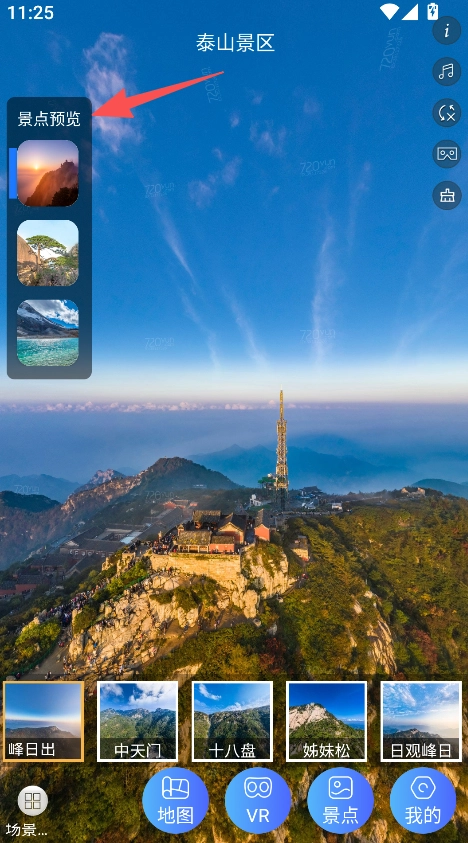 3、點(diǎn)擊目標(biāo)景點(diǎn),查看其不同區(qū)域的全景內(nèi)容。