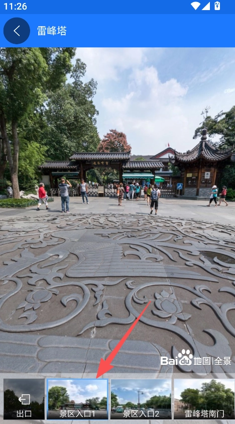2、支持景點(diǎn)全景瀏覽功能,點(diǎn)擊目標(biāo)景點(diǎn),查看其景區(qū)入口等不同區(qū)域的全景畫(huà)面。