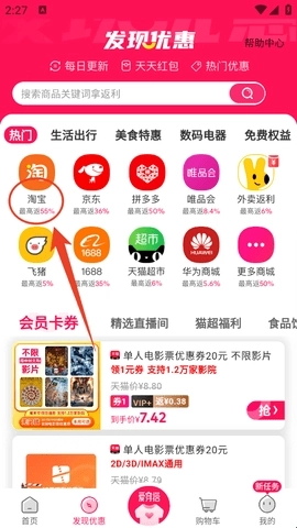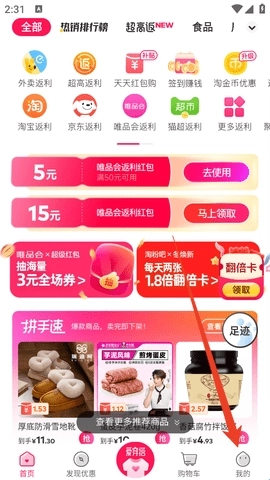 3、往下翻下面有很多折扣商品或者返利商品,看看有沒有你要買的,沒有的話直接去搜索。