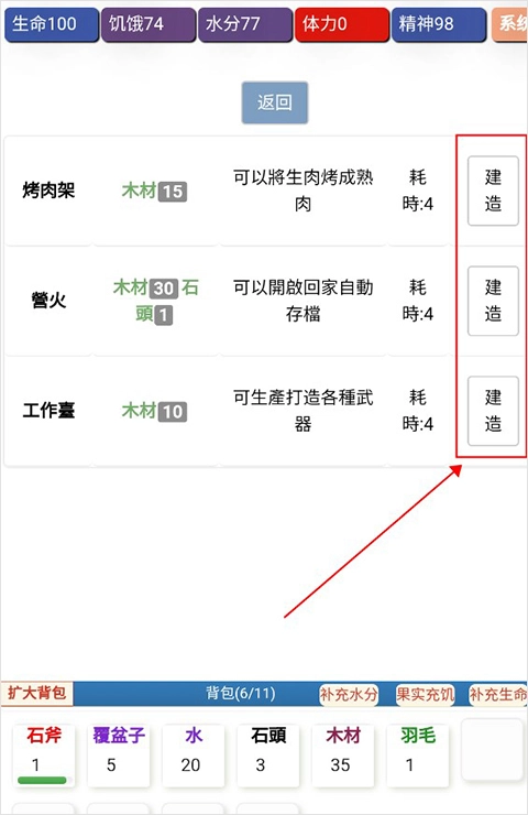 5、玩家可以通過睡覺來補(bǔ)充體力,使用木頭可以制作床。