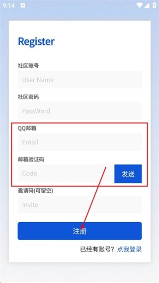 5、接著填寫QQ郵箱與郵箱驗(yàn)證碼,點(diǎn)擊注冊按鈕,即可完成賬號注冊流程。