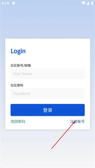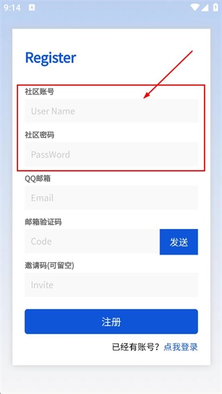 4、在注冊頁面,依次填寫社區(qū)賬號與社區(qū)密碼這兩項(xiàng)信息。