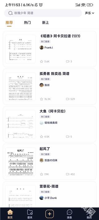 4、進(jìn)入首頁,可以看到這里有推薦,熱門和新上的樂譜;