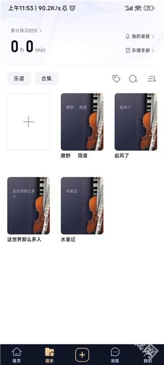 5、點(diǎn)擊譜夾,在這里你可以查看自己的練習(xí)時(shí)長以及收藏的樂譜。