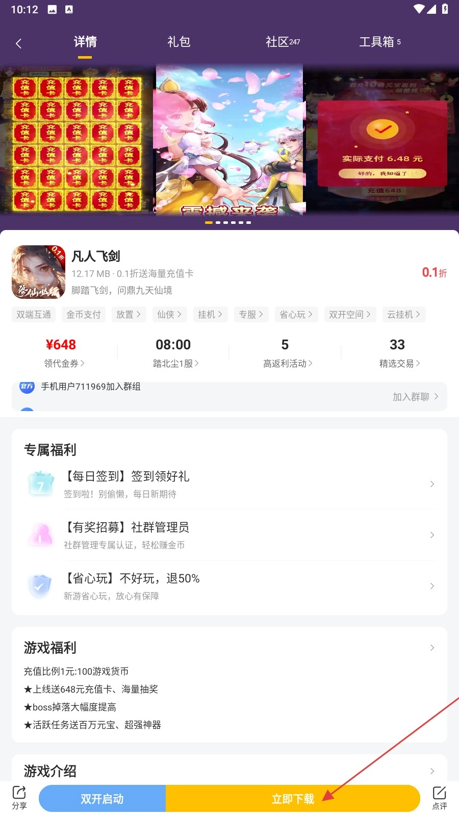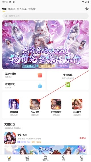 2、在首頁瀏覽推薦游戲,找到感興趣的如【凡人飛劍】點擊進入詳情頁。