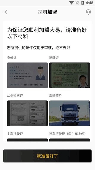 2、司機加盟,為了保證您順利加盟大易,請準備好以下材料,點擊我準備好了;