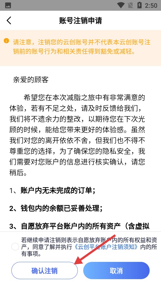 4、在確認(rèn)賬戶內(nèi)不存在未完成的訂單,并且錢包余額已得到妥善處理等相關(guān)條件都滿足后,點(diǎn)擊【確認(rèn)注銷】按鈕,即可完成賬號(hào)的注銷操作。