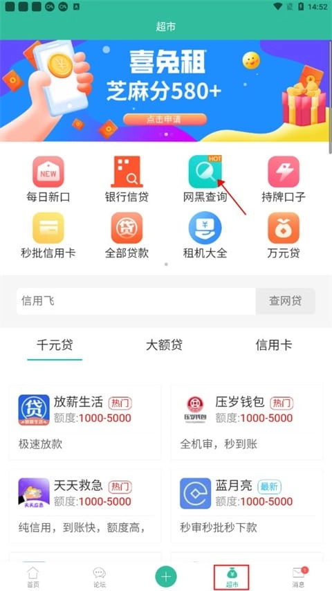 1、第一步先進(jìn)入卡農(nóng)社區(qū),接著點(diǎn)擊超市選項(xiàng),之后再點(diǎn)擊網(wǎng)黑查詢功能。