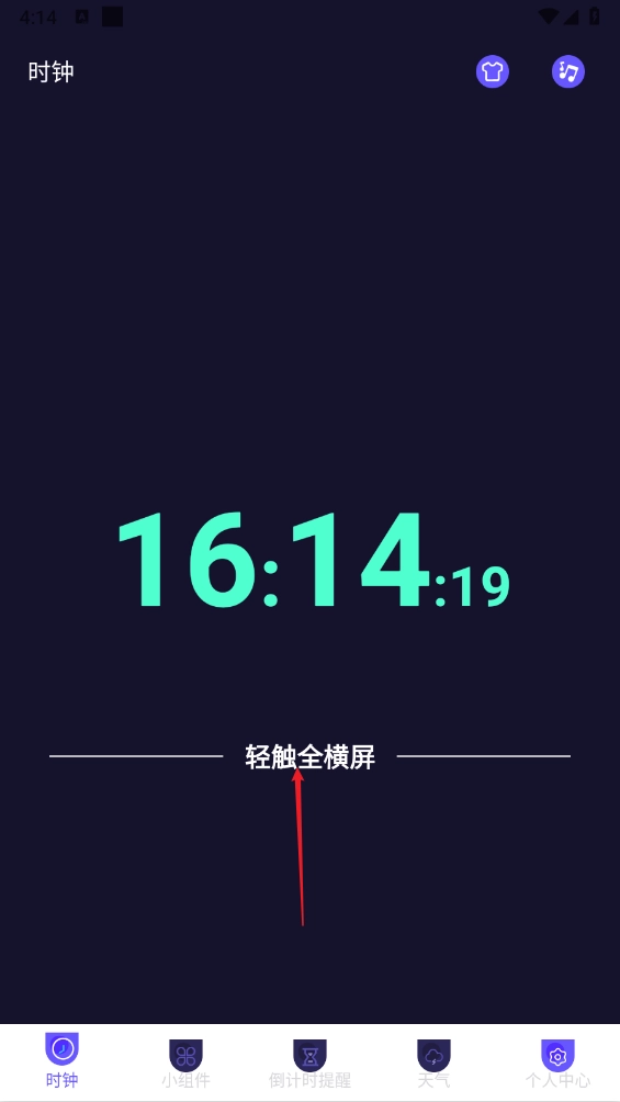2、進(jìn)入時(shí)鐘板塊后,輕觸即可切換至全橫屏模式,右上角還能自定義皮膚。