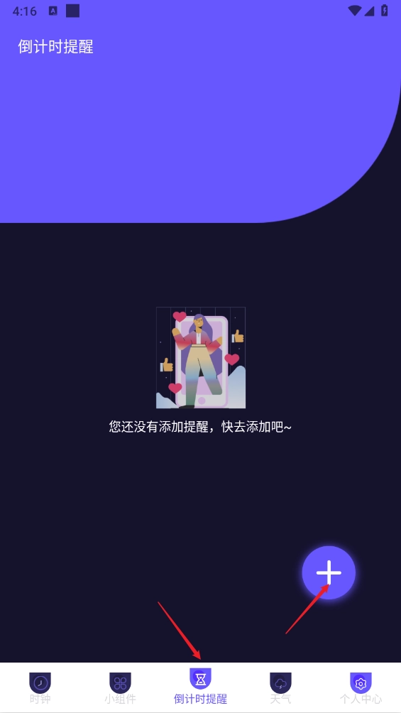 2、如圖所示,點(diǎn)擊"+"號(hào)進(jìn)行添加倒計(jì)時(shí)提醒。
