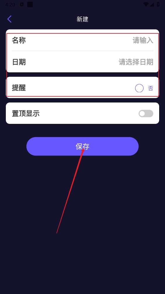 3、最后填寫名稱與日期,再根據(jù)需要選擇提醒功能和置頂顯示選項(xiàng),點(diǎn)擊“保存”按鈕就完成了。