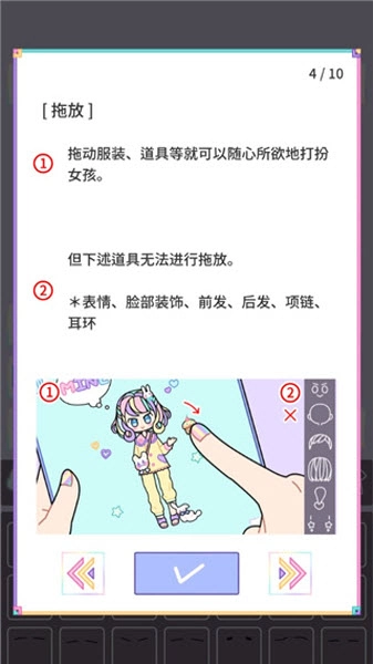 3. 拖放功能:在粉彩女孩游戲里,玩家能通過拖放服裝和道具,自由地為女孩進行裝扮。不過,以下這些道具不支持拖放操作:表情、臉部裝飾、前發(fā)、后發(fā)、項鏈、耳環(huán)。