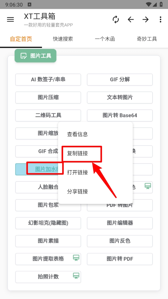 2、進入主頁選擇所需復(fù)制鏈接的工具并長按。