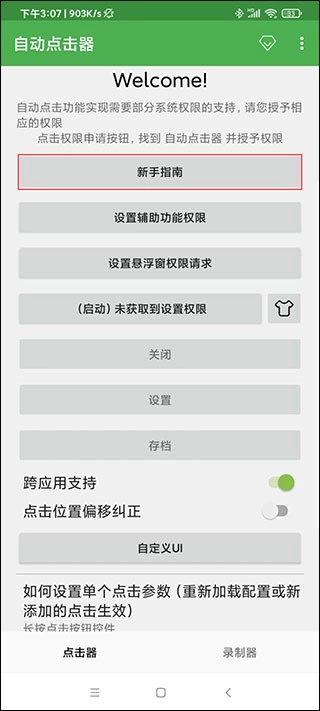 1、啟動(dòng)自動(dòng)連點(diǎn)器應(yīng)用,在其首頁(yè)能找到“新手指南”板塊,可通過(guò)該板塊了解使用說(shuō)明;進(jìn)行操作前,需先點(diǎn)擊“設(shè)置輔助功能權(quán)限”這一選項(xiàng)。