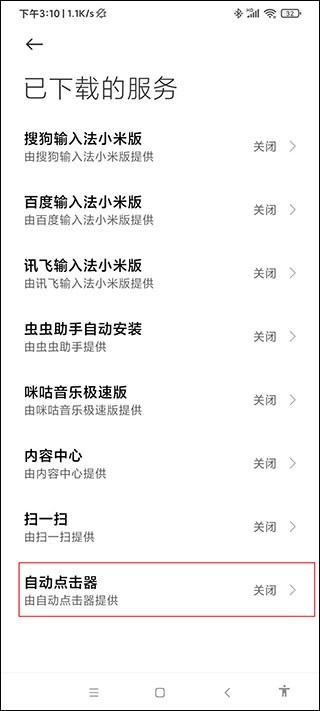 5、找到“自動(dòng)點(diǎn)擊器”,也是默認(rèn)關(guān)閉的,需要開(kāi)啟。