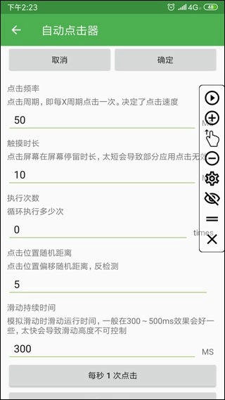 通過(guò)設(shè)置可以設(shè)置全局的點(diǎn)擊間隔,觸摸時(shí)長(zhǎng),重復(fù)次數(shù)。還有快速設(shè)置功能