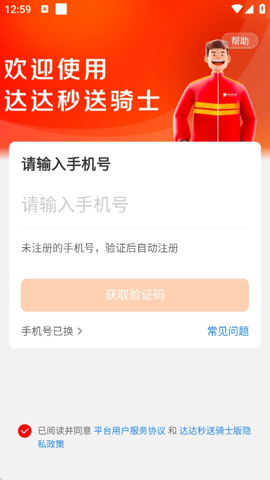 1.打開(kāi)達(dá)達(dá)秒送騎士后輸入手機(jī)號(hào)登錄