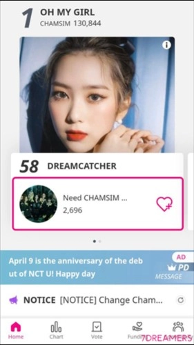點擊捕夢者主打歌旁邊的心形。每個帳戶(每臺設備)每天最多可以投票 300 次。1票 = 3個chamsims