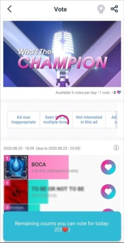 若要給偶像冠軍投票,你可以點擊屏幕底部那個帶有心形圖標的“投票”選項卡,接著向下滑動頁面,直至看到冠軍徽標出現。